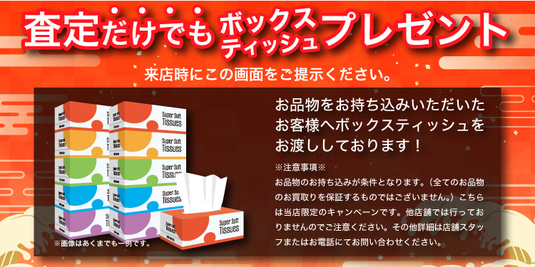 お品物の名前や種類、状態、またはブランド名、型番などの情報があると、概ねの査定額をお伝えできるかと思います。